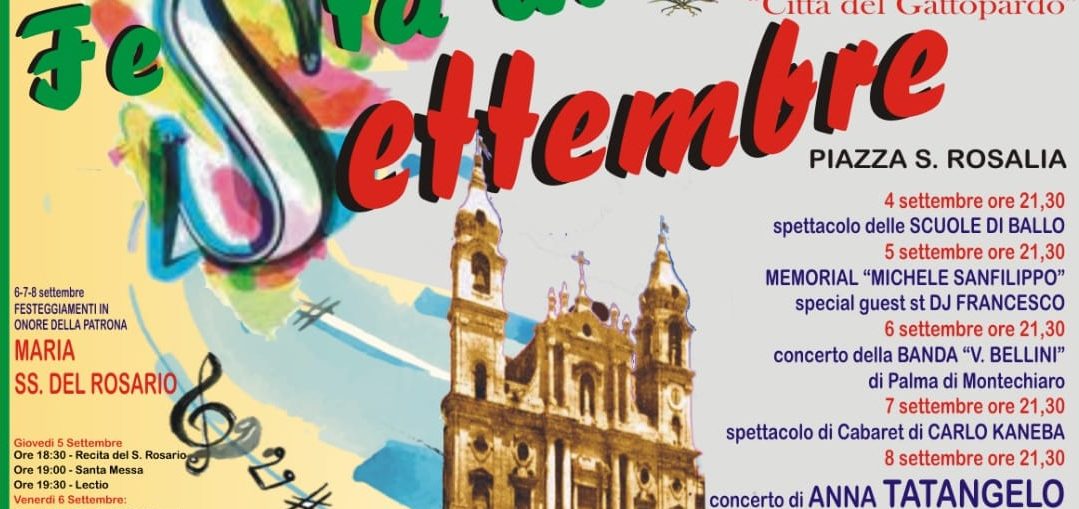 Al via a Palma di Montechiaro i festeggiamenti in onore della Patrona, Maria Ss del Rosario. Accanto alle celebrazioni religiose, l'amministrazione comunale, diretta dal sindaco Stefano Castellino, ha allestito un cartellone di iniziative che si protrarranno fino al 21 settembre.Le celebrazioni religiose avranno inizio domani, giovedì 5 settembre, per concludersi ...Continua