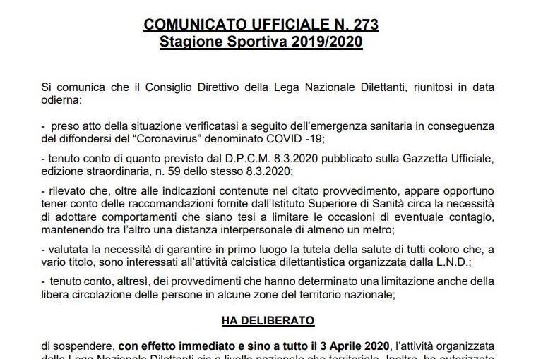 Dopo una riunione della Lega Nazionale Dilettanti, tenutasi in mattinata per discutere sugli effetti in ambito calcistico del Covid -19, è arrivata la tanto attesa comunicazione ufficiale: Si comunica che il Consiglio Direttivo della Lega Nazionale Dilettanti, riunitosi in data odierna ha deliberato di sospendere, con effetto immediato e sino a ...Continua