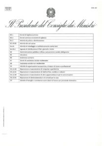 - sono sospese tutte le attività produttive industriali e commerciali, ad eccezione di quelle indicate nell’allegato 1 e salvo quanto di seguito Le attività professionali non sono sospese e restano ferme le previsioni di cui all’articolo 1, punto 7, decreto del Presidente del Consiglio dei ministri 11 marzo 2020. Per le pubbliche amministrazioni resta fermo quanto previsto dall’articolo 87 del decreto-legge 17 marzo 2020 n. 18. Resta fermo, per le attività commerciali, quanto disposto dal decreto del Presidente del Consiglio dei ministri 11 marzo 2020 e dall’ordinanza del Ministro della salute del 20 marzo 2020. L’elenco dei codici di cui all’allegato 1 può essere modificato con decreto del Ministro dello sviluppo economico, sentito il Ministro dell’economia e delle finanze;