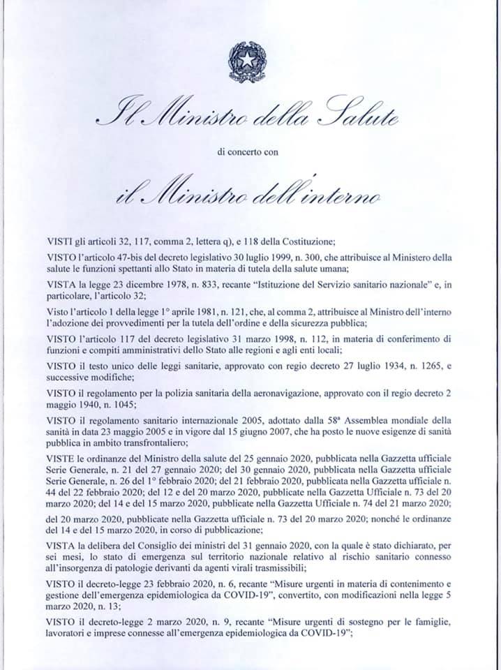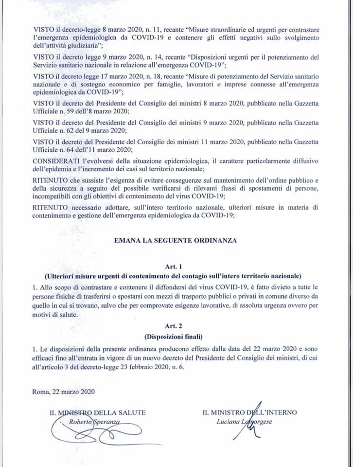 Nuova ordinanza del ministero dell’Interno e della Salute che al fine di contrastare e contenere il diffondersi del coronavirus “fa divieto a tutte le persone fisiche” di “trasferirsi o spostarsi con mezzi di trasporto pubblici o privati in Comune diverso da quello in cui si trovano”, salvo che “per comprovate esigenze lavorative”, di “assoluta urgenza” o per “motivi di salute”.