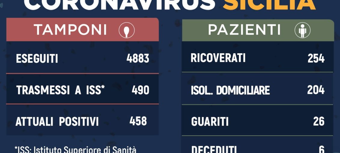 Sono 458 (79 più di ieri) i contagiati di Coronavirus in Sicilia